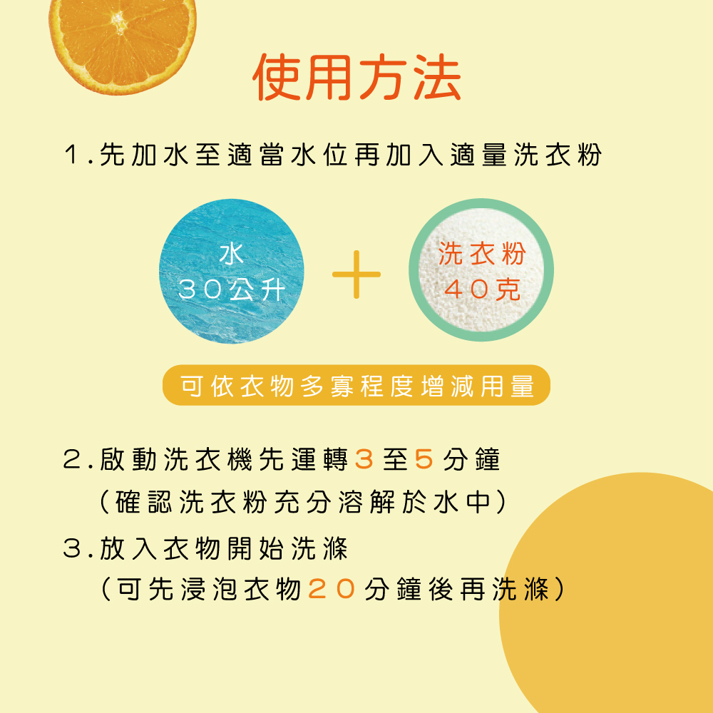 使用方法:依據衣物量取適量洗衣粉倒入洗劑槽或水中,充分溶解後再放入衣物清洗。